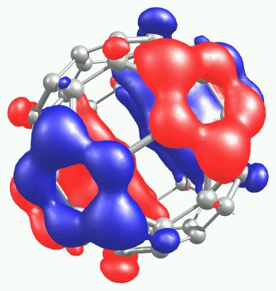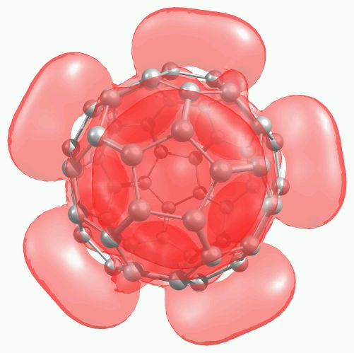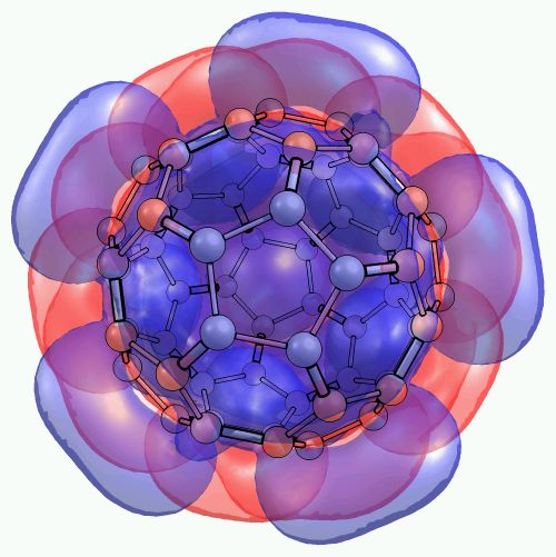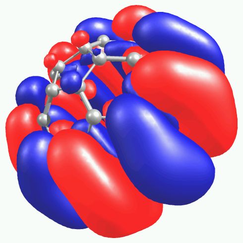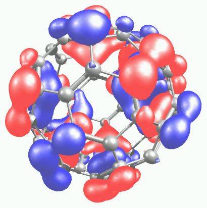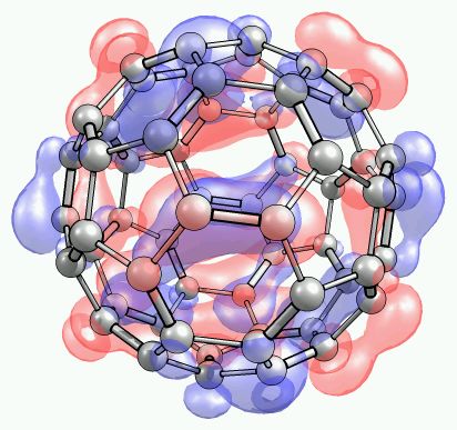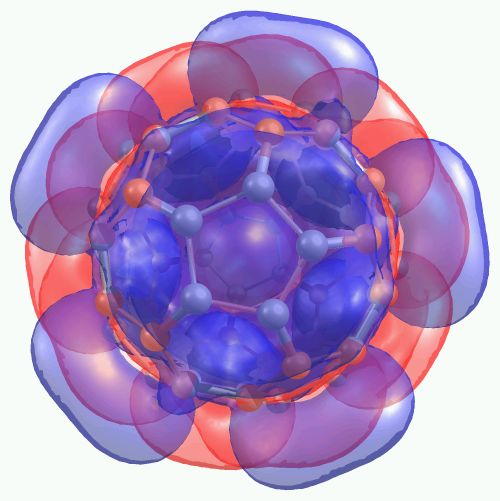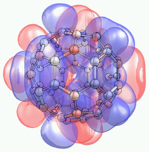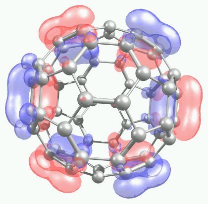 Fuleren C60 ma średnicę ok. 0,7 nm. Wizualizacja orbitali pokazuje z koniugowany układ wiązań. Obrazy orbitali możemy potraktować również jako sztukę pod tytułem "Kwiatki chemiczne" Obrazy generowane programem ChemCraft http://www.chemcraftprog.com/ ze struktur z optymalizowanych metodą DFT.